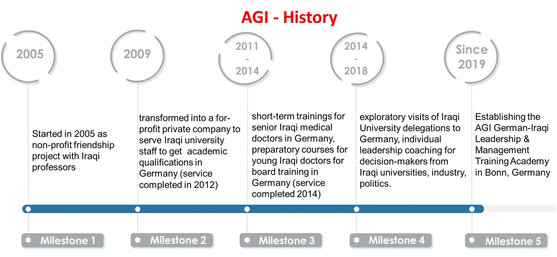 The letters AGI are the abreviation of our company name 'Access Germany Iraq'. When the company was founded in 2009 by a group of German and Iraq friends, we wanted a name that represents our mission to connect experts from both countries. The Iraqi-Arabic pronounciation of AGI أجي means "I'm coming over!"